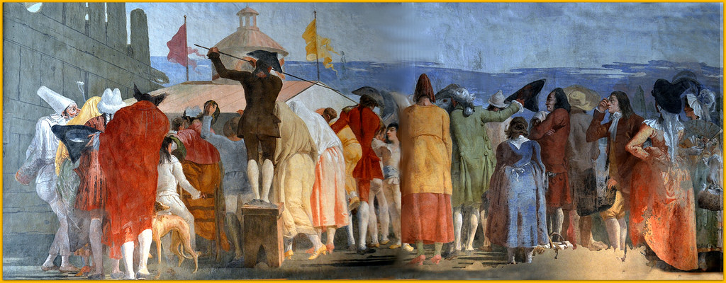 Giandomenico Tiepolo (Venecia 1727-1804) acompañó a su padre Giambattista en su viaje a Madrid, regresando a Italia después de su muerte. Durante mucho tiempo trabajó siguiendo las tradiciones pictóricas de la familia, pero acabó por imponer su estilo personal, haciendo estallar toda su fantasía en el ámbito de la decoración de villas, desarrollando una personalidad propia encaminada hacia la caricatura y lo grotesco. Alcanza la cumbre artística con las escenas de la villa de Zianigo, cerca de Venecia (1791-93), una casa de campo comprada por su padre Giambattista. Los frescos fueron desmontados en 1906, poco antes de la destrucción de la villa, y ahora se exponen en la Ca’ Rezzonico. La mirada del espectador se ve atraída por un grupo de Pulcinellas, o Polichinelas vestidos tradicionalmente de blanco. Se trata de una imagen irónica, satírica y crítica de la sociedad de la época. El artista representa los personajes de la Comedia del Arte como si fueran aves de rapiña, glotones y perezosos, apartándose así de los temas habituales en la decoración de villas. En estas escenas lúdicas y singulares del personaje de Polichinela, o en la cruel representación de la aristocracia de veraneo, Giandomenico desarrolló una sátira muy amarga donde toma forma el espíritu “burgués”, anticipándose así a Goya y a Daumier.